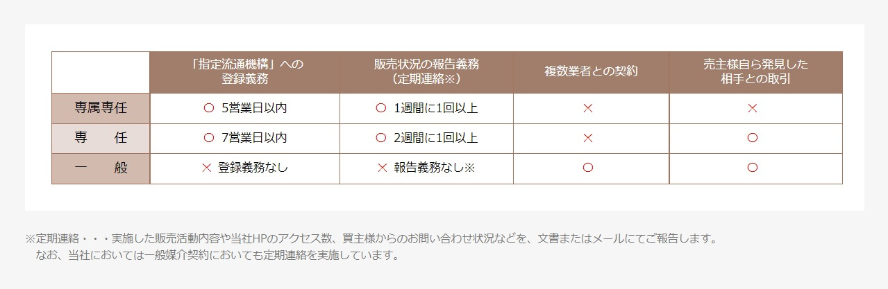 依頼者は、依頼した宅建業者以外の宅建業者に重ねて売買または交換の媒介または代理を依頼することができません。 依頼を受けた宅建業者は、売物件情報を指定流通機構(レインズ)に7営業日以内に登録し、2週間に一度以上文書等で販売状況を報告します。