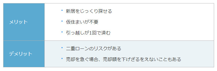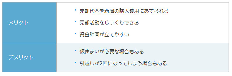 売却先行とは、売却活動を先にしてから新居の購入をする方法です。以下のようなメリット・デメリットがあります。