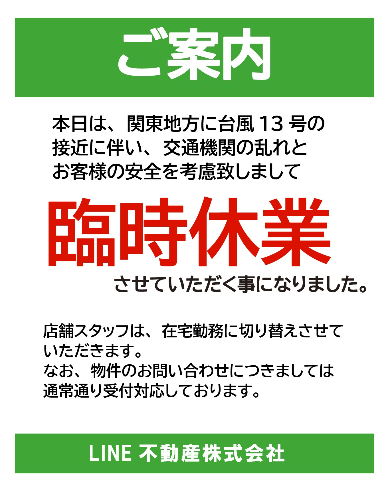 お客様の安全のため、本日は店舗を臨時休業とさせていただきます。